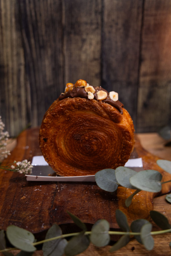 Rowl pâte feuilletée garnie de nutella et noisettes.